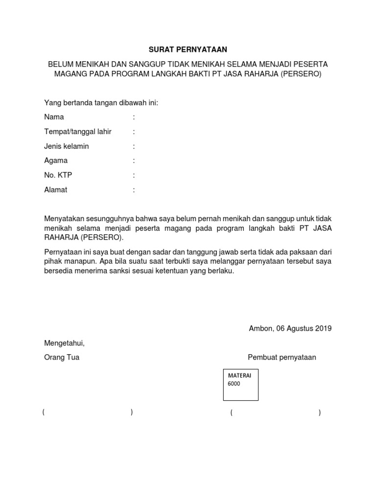 Berikut merupakan kumpulan contoh surat pernyataan agar kalian dapat lebih mudah memahami tentang surat pernyataan. Surat pernyataan tidak memakai narkoba. Berikut ini adalah cuplikan isi surat pernyataan bersedia tidak menikah selama magang di jasa raharja terbaru: Doc surat pernyataan belum menikah dan sanggup tidak format 595 x 842 surat pernyataan tidak menikah format 638 x 1051 pixel download contoh surat pernyataan ijin orang tua tidak menikah dan format 505 x 606 pixel download surat pernyataan tidak menikah format 638 x 1051 pixel download pernyataan sanggup tdk kawin format 728 x 1030 pixel download contoh surat pernyataan belum menikah dan bersedia. Demikian pernyataan ini saya buat dengan sesungguhnya dan penuh rasa tanggung jawab tampa tekanan dari pihak manapun juga. Contoh surat pernyataan belum menikah ketika seseorang hendak melamar suatu pekerjaan ada kalanya perusahaan yang dituju memberikan beberapa syarat khusus. Demikian surat pernyataan ini saya buat dengan penuh kesadaran dan tanpa ada paksaan atau tekanan dari pihak manapun. Saya yang bertanda tangan di bawah ini: Download surat izin dari orang tua pernyataan belum menikah surat download format surat lain: Jika kemudian hari ditemukan bukti bahwa pernyataan ini tidak benar, saya bersedia menerima konsekuensi : Selama masa ini, tidak jarang karyawan diminta membuat contoh surat pernyataan tidak menikah selama menjadi peserta magang. Surat pernyataan tidak menikah 1. Ada beberapa persyaratan yang umumnya harus dilengkapi oleh pelamar kerja ketika hendak melamar pekerjaan di suatu perusahaan.